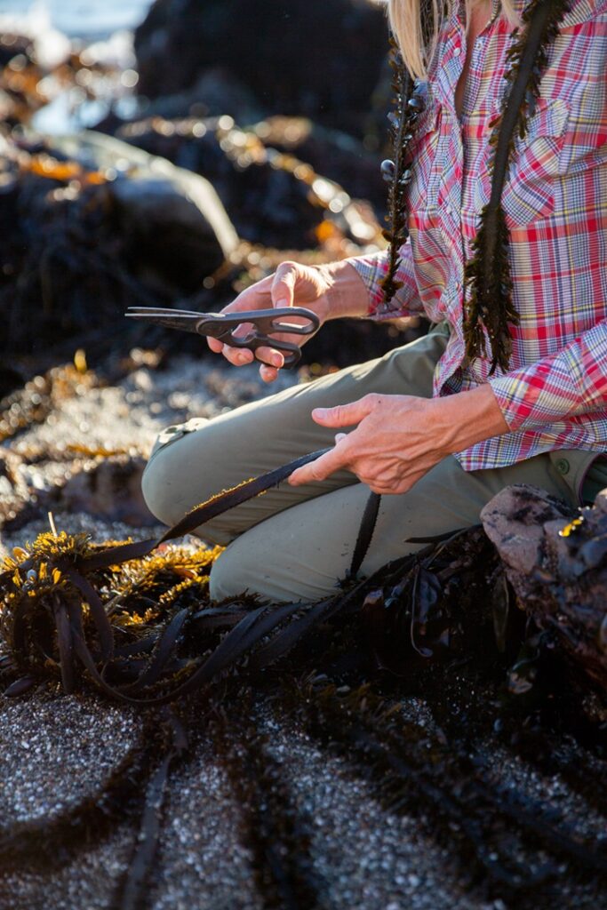 “If you know where to cut on the algae, it can quickly regrow—this is crucial information,” she explains. “When my team of harvesters and I arrive at the beach I have selected for the day, we assess its species composition, see what is looking healthy and abundant, sense the vibe and mood of the ocean, ask questions internally and aloud—are we welcomed, is this okay, how much is enough, when to stop, etc. There is a lot to take in and observe, in addition to human safety.”