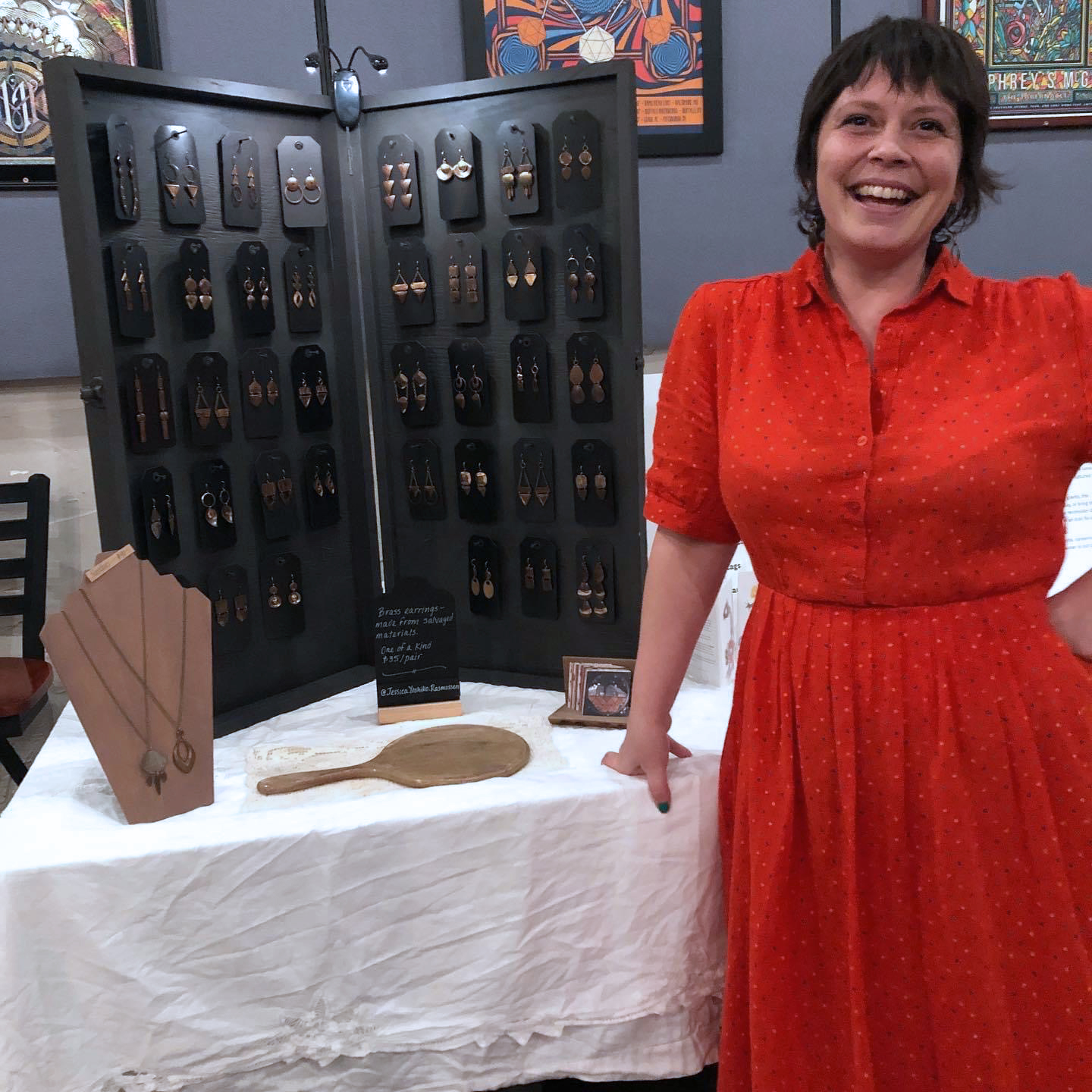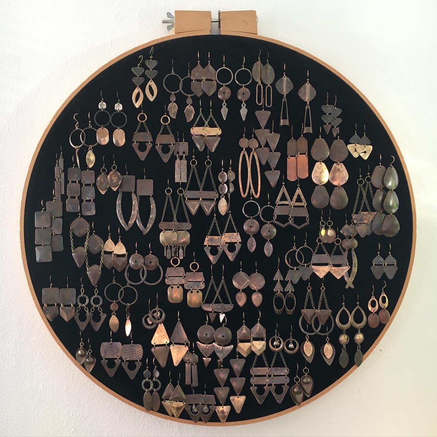 Outside of Bataeff’s junkyard is a 4’x4’ bucket of brass cast-offs that have been subjected to the elements ever since they were delivered 10 years ago. “I have spent hours combing through it looking for shapes and sizes that appeal to me,” says assemblage artist Jessica Yoshiko Rasmussen, who then takes the scraps back to her studio at Santa Rosa’s 33Arts (the third studio she has occupied there since 2015) and uses a dremel tool to clean off layers of rust and wear, revealing their unique natural patinas. These found pieces become artful jewelry, mainly earrings, as well as parts of her often sculptural mixed-media works. “It’s like a really fun puzzle, figuring out how these repurposed pieces go together. They all have an energy of their own,” Rasmussen says.